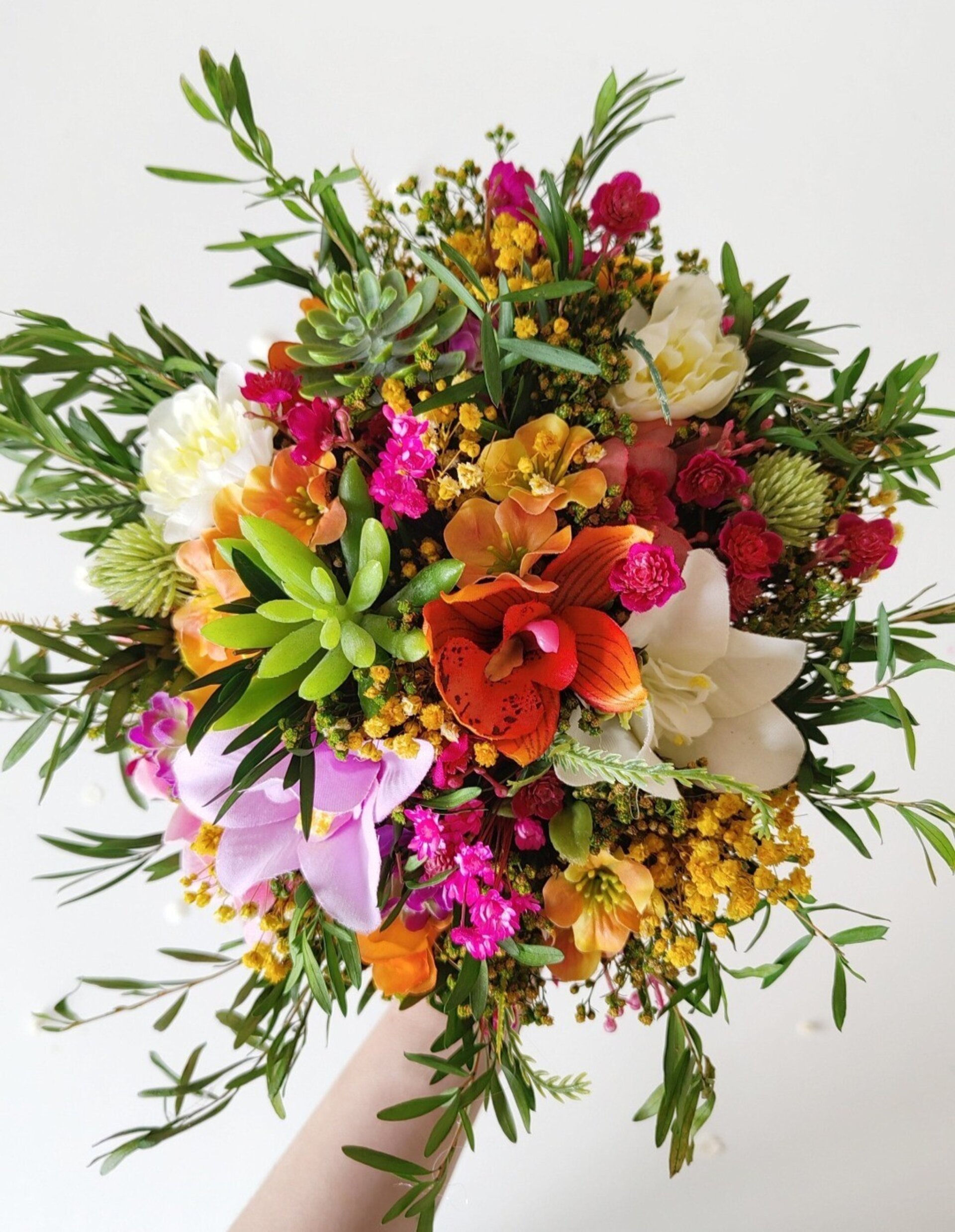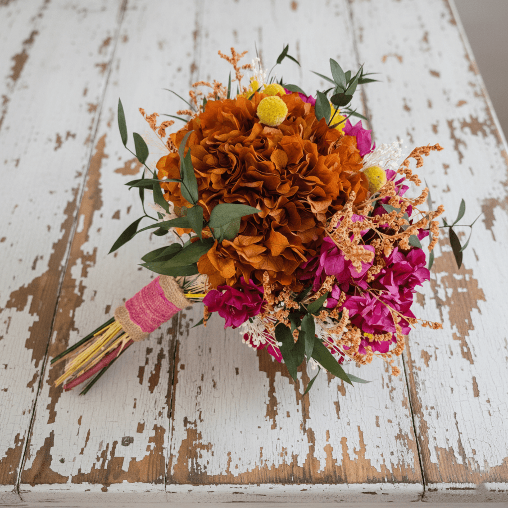 Ramo de novia de Flores Preservadas color Magenta y Naranja