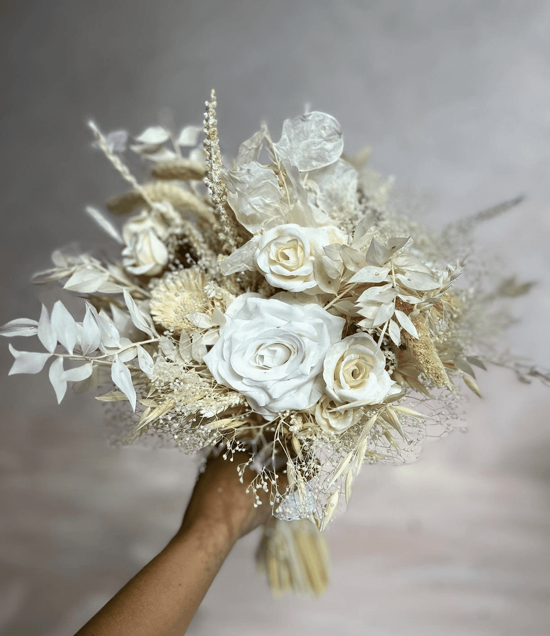Ramo de Novia Bohemio Blanco: Flores Preservadas, Secas y de Tela